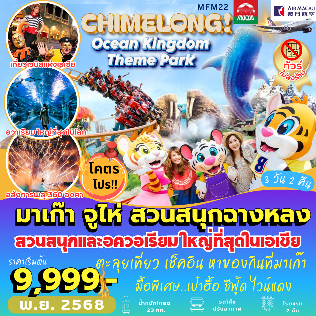 | ราคาเริ่มต้น : 9999 | ประเทศ : ทัวร์จีน,ทัวร์มาเก๊า,ทัวร์เอเชีย | จำนวนวัน : 3 วัน 2 คืน | เดือนที่ออกเดินทาง : เดือนพฤศจิกายน 2568 | สายการบิน : Air Macau (NX) |