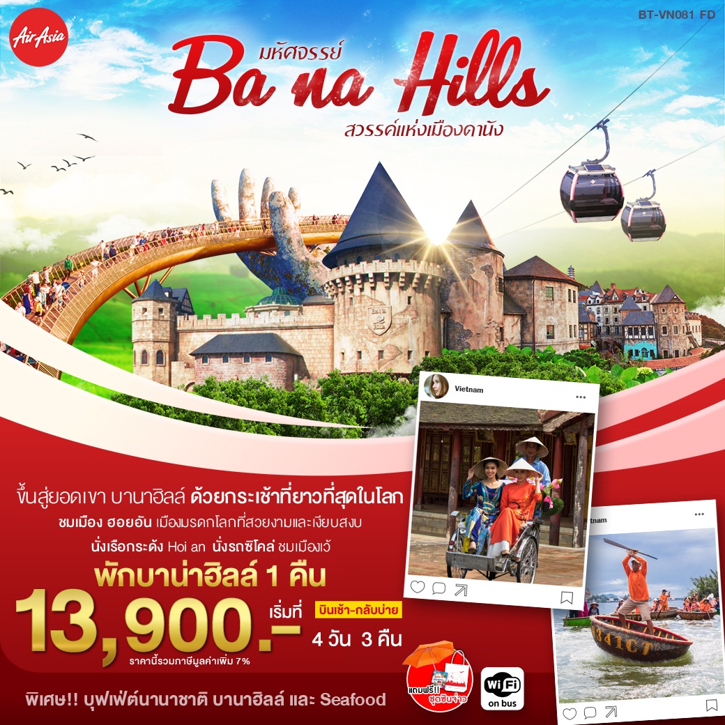 ราคาเริ่มต้น : 13900 | ประเทศ : ทัวร์เวียดนาม | จำนวนวัน : 4 วัน 3 คืน | เดือนที่ออกเดินทาง : มีนาคม-พฤศจิกายน 2563 | สายการบิน : Air Asia (FD) |