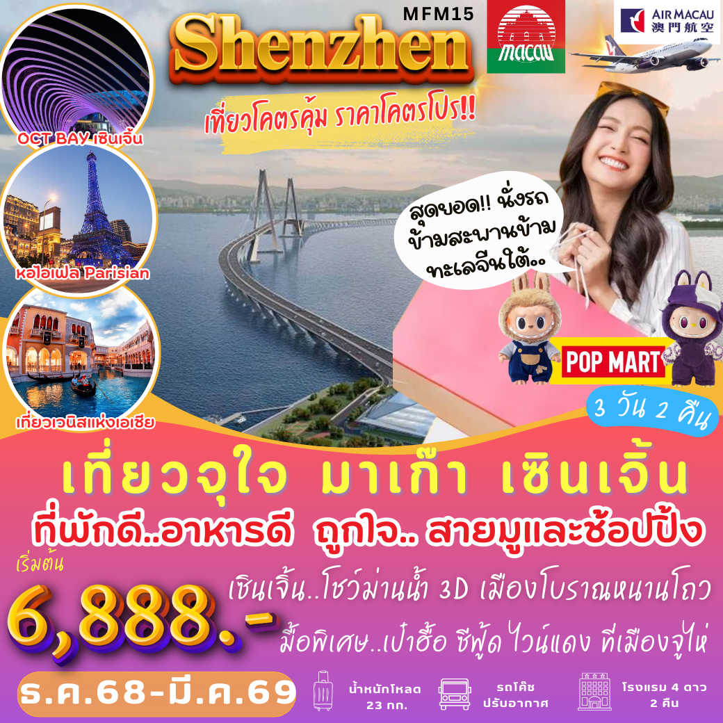 นำท่านเดินทางสู่ เมืองเซินเจิ้น โดยนั่งรถข้ามสะพานทะเลจีนใต้ ที่ยาวที่สุดในโลก สมกับเป็นพี่ใหญ่แห่งแดนมังกร สะพานข้ามทะเลจีนใต้ Shenzhen–Zhongshan Link ทางด่วนข้ามทะเล ที่เชื่อมระหว่างเมืองเซินเจิ้นและเมืองจงซาน มณฑลกวางตุ้ง (ประเทศจีน) นอกจากสะพานแล้วยังมีอุโมงค์ใต้ทะเลยาว 6.8 กิโลเมตร เปิดให้บริการ 30–06–24 ช่วยลดเวลาในการเดินทางจาก 2 ชม. เหลือแค่ 40 นาที
