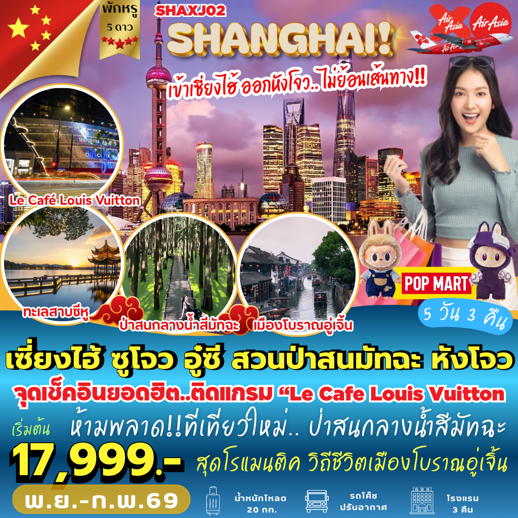 | ราคาเริ่มต้น : 17999 | ประเทศ : ทัวร์จีน,ทัวร์เซี่ยงไฮ้,ทัวร์เอเชีย | จำนวนวัน : 5 วัน 3 คืน | เดือนที่ออกเดินทาง : พฤศจิกายน 68 - กุมภาพันธ์ 69 | สายการบิน : Air Asia X (XJ) |
