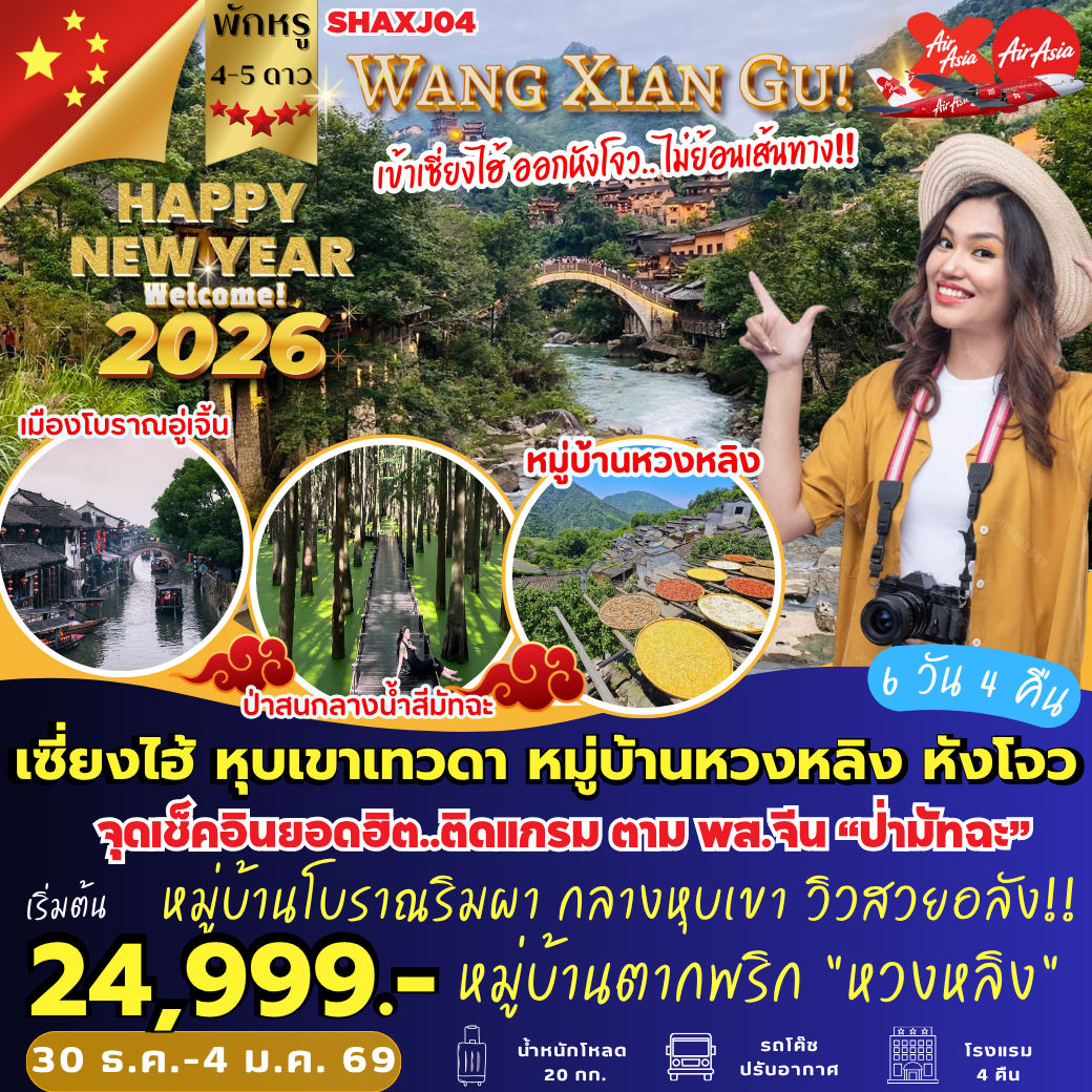 | ราคาเริ่มต้น : 24999 | ประเทศ : ทัวร์จีน,ทัวร์เซี่ยงไฮ้,ทัวร์เอเชีย,ทัวร์ปีใหม่ | จำนวนวัน : 6 วัน 4 คืน | เดือนที่ออกเดินทาง : 30 ธ.ค.-04 ม.ค. 2569 | สายการบิน : Air Asia X (XJ) |
