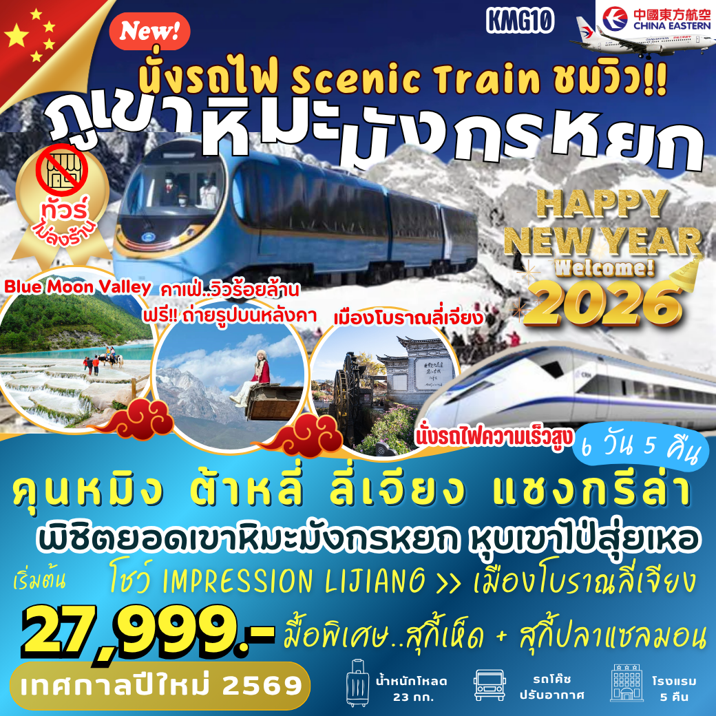 นำท่าน เปิดประสบการณ์ใหม่กับขบวนพิเศษรถไฟชมวิวลี่เจียง–ภูเขาหิมะมังกรหยก (รวมค่ารถไฟชมวิว) หนึ่งในเส้นทางชมวิวที่สวยและโรแมนติกที่สุดของจีนความพิเศษของรถไฟชมวิวลี่เจียง-ภูเขาหิมะมังกรหยก คือ ตู้ขบวนของรถไฟจะมีหน้าต่างเป็นกระจกใสบานใหญ่แบบพาโนรามาให้นักท่องเที่ยวได้นั่งชมวิวทิวทัศน์ของธรรมชาติสวยๆ สองข้างทางได้อย่างชัดเจน