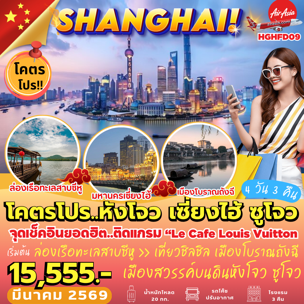 | ราคาเริ่มต้น : 15555 | ประเทศ : ทัวร์จีน,ทัวร์เซี่ยงไฮ้,ทัวร์เอเชีย | จำนวนวัน : 4 วัน 3 คืน | เดือนที่ออกเดินทาง : มีนาคม 2569 | สายการบิน : Air Asia (FD) |