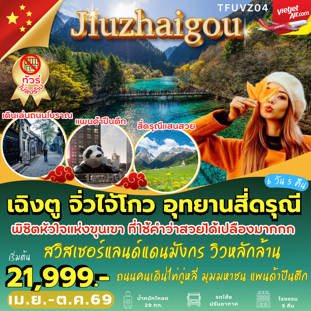 | ราคาเริ่มต้น : 21999 | ประเทศ : ทัวร์จีน,ทัวร์จิ่วจ้ายโกว,ทัวร์เอเชีย | จำนวนวัน : 6 วัน 5 คืน | เดือนที่ออกเดินทาง : เมษายน –ตุลาคม 2569 | สายการบิน : Vietjet AIR (VZ) |