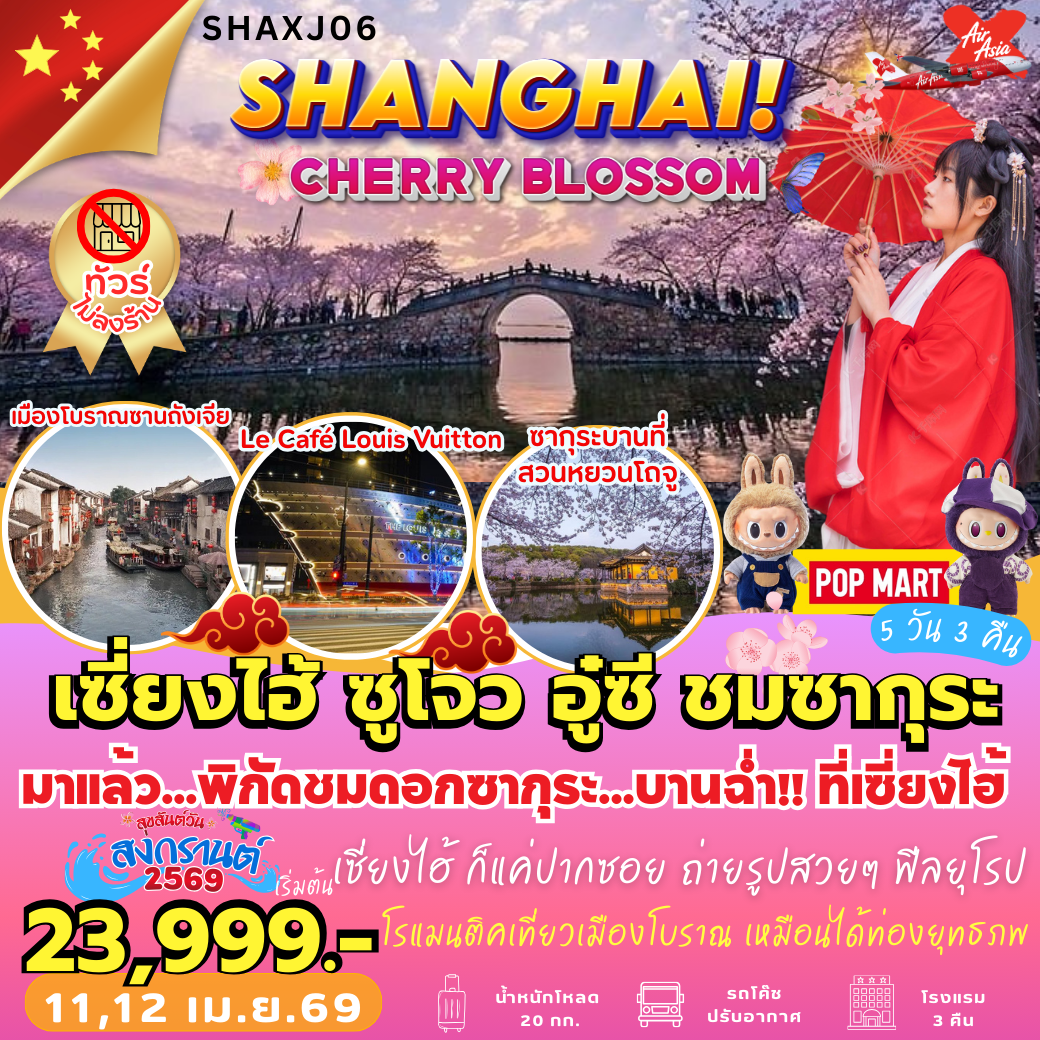 | ราคาเริ่มต้น : 23999 | ประเทศ : ทัวร์จีน,ทัวร์เซี่ยงไฮ้,ทัวร์เอเชีย,ทัวร์สงกรานต์ | จำนวนวัน : 5 วัน 3 คืน | เดือนที่ออกเดินทาง : 11–15 // 12–16 เมษายน 69 *สงกรานต์ | สายการบิน : Air Asia X (XJ) |
